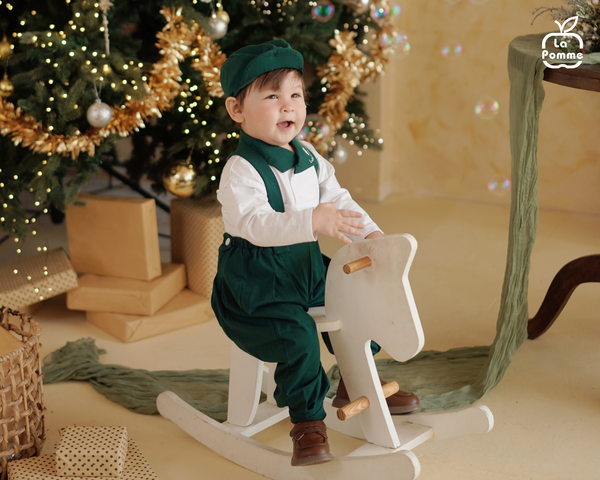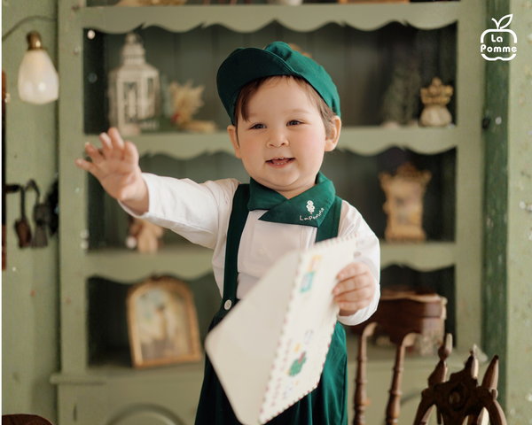 Với chiếc mũ beret xanh lá nghiêng nghiêng, lá thư nhỏ xinh trên tay và ánh mắt tò mò đầy hồn nhiên, bé Mía đã mang đến một bộ ảnh ấm áp đầy chất sáng tạo. Tone màu vintage kết hợp pastel càng làm nổi bật vẻ đẹp tinh tế của trang phục La Pomme, tạo nên tổng thể nhẹ nhàng nhưng ấn tượng. Concept từ "chú bưu tá" còn đặc biệt ghi điểm cộng khi đã thể hiện rất tốt thông điệp của bộ sưu tập Noel 2025 Petit Papa Noel - "Màn hóa thân diệu kỳ".