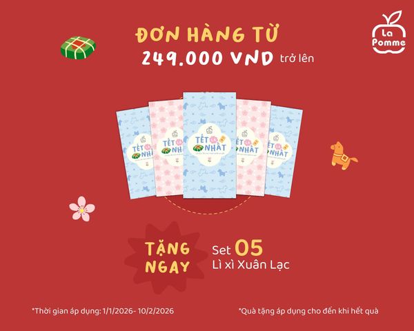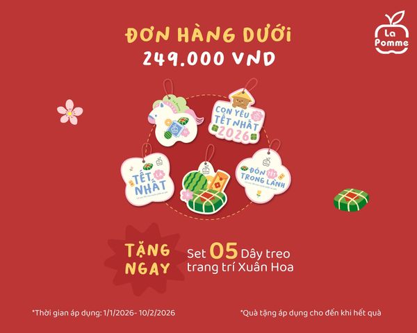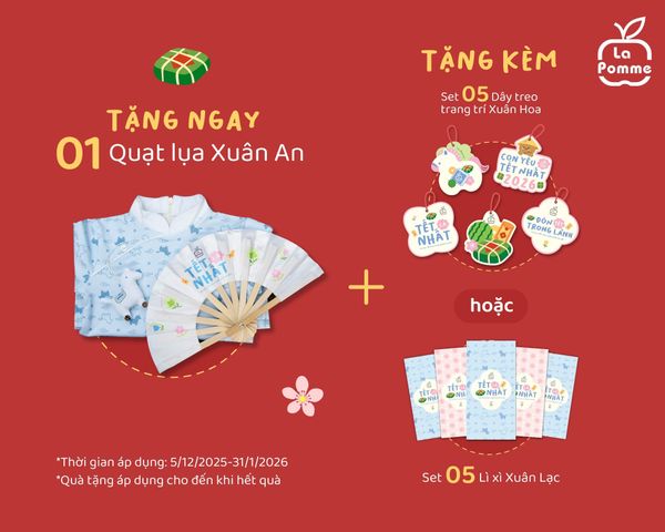 Dành riêng cho khách hàng mua sắm BST "Tết Là Nhất" 2026, La Pomme mang đến Set quà Xuân Hoa - An Lạc – 03 món quà được thiết kế riêng với số lượng giới hạn, mang trong mình những câu chuyện nhỏ xinh về Tết và tuổi thơ, cùng bé nghênh xuân phú quý trọn vẹn.